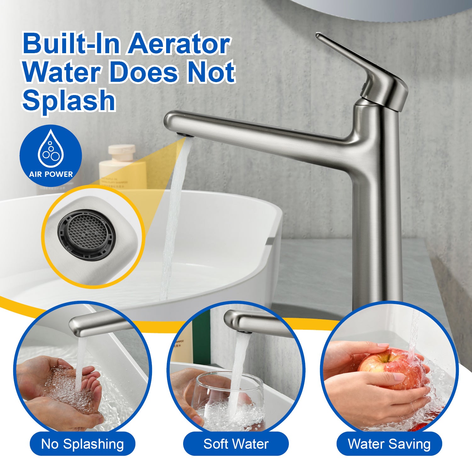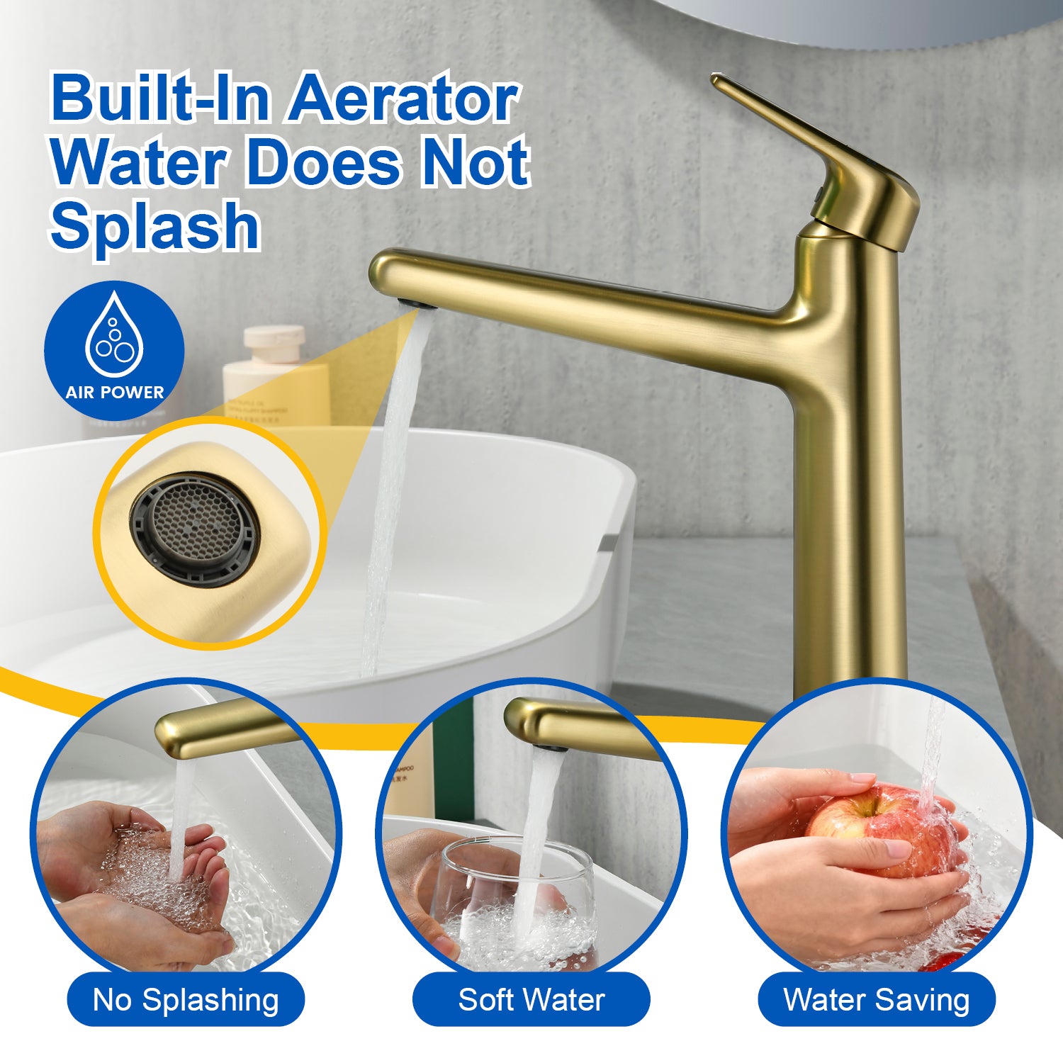 Built-In Aerator The built-in aerator in the bathroom faucet not only makes the water flow softer, but also saves more water and reduces noise. Single-Handle Bathroom Faucet The smooth handling of a single lever makes it easier to regulate water flow or temperature. A clear and steady laminar stream that...