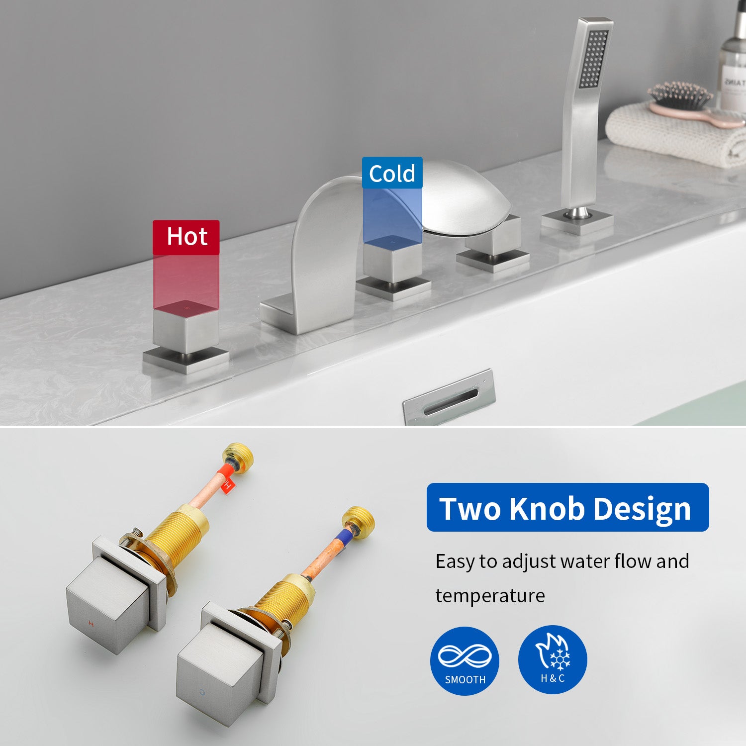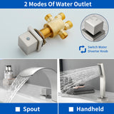 - Double handle easy to control hot water and cold water which is the best choice for bathtub.You Just simply rotate the lovely square knob to switch water to hand shower or waterfall spout.