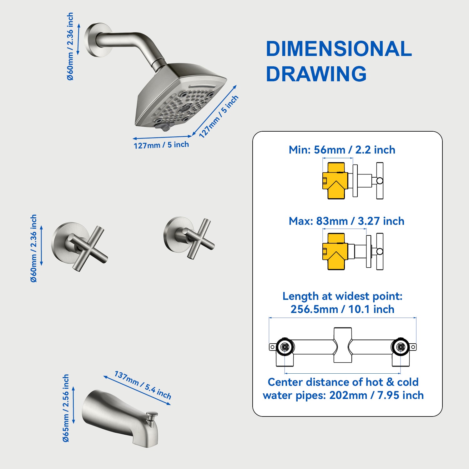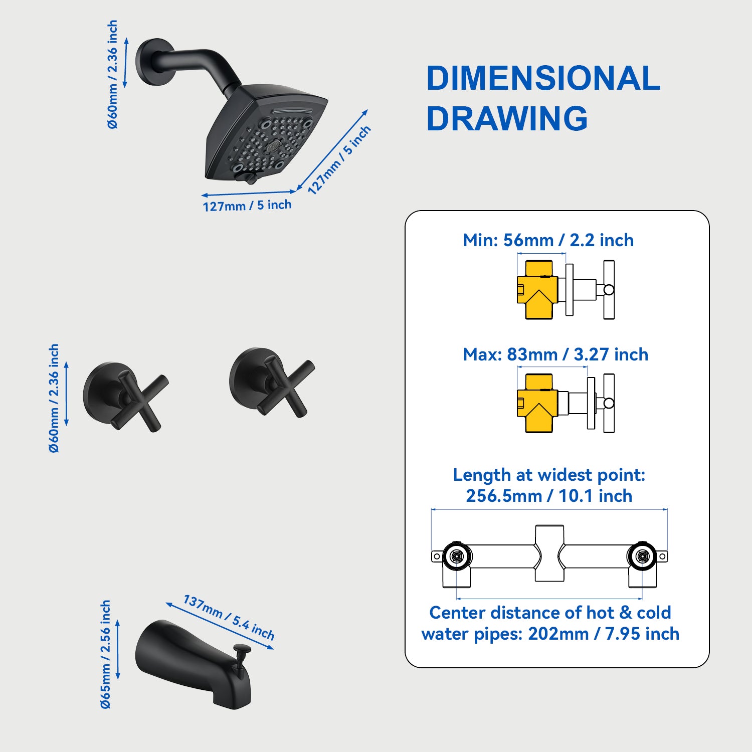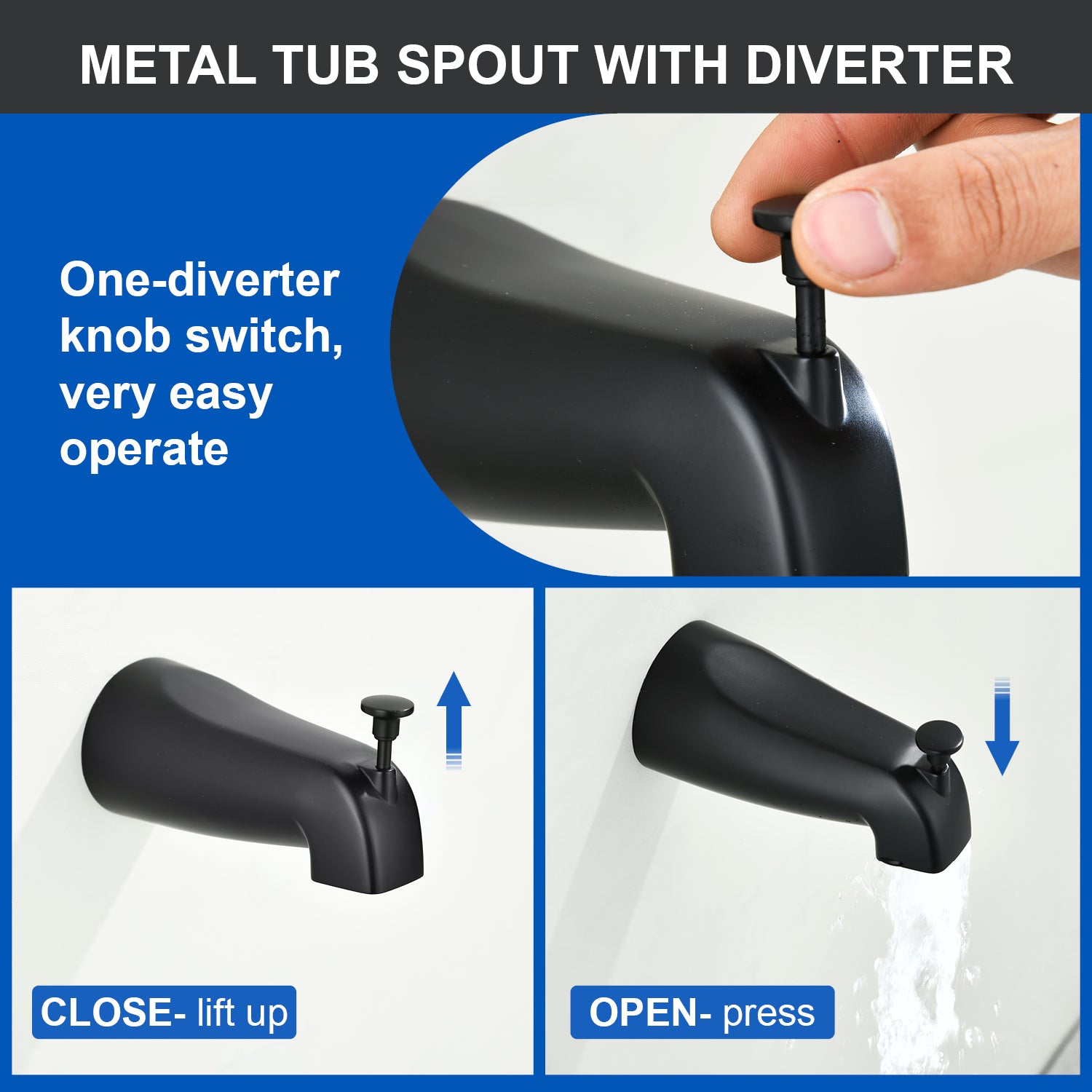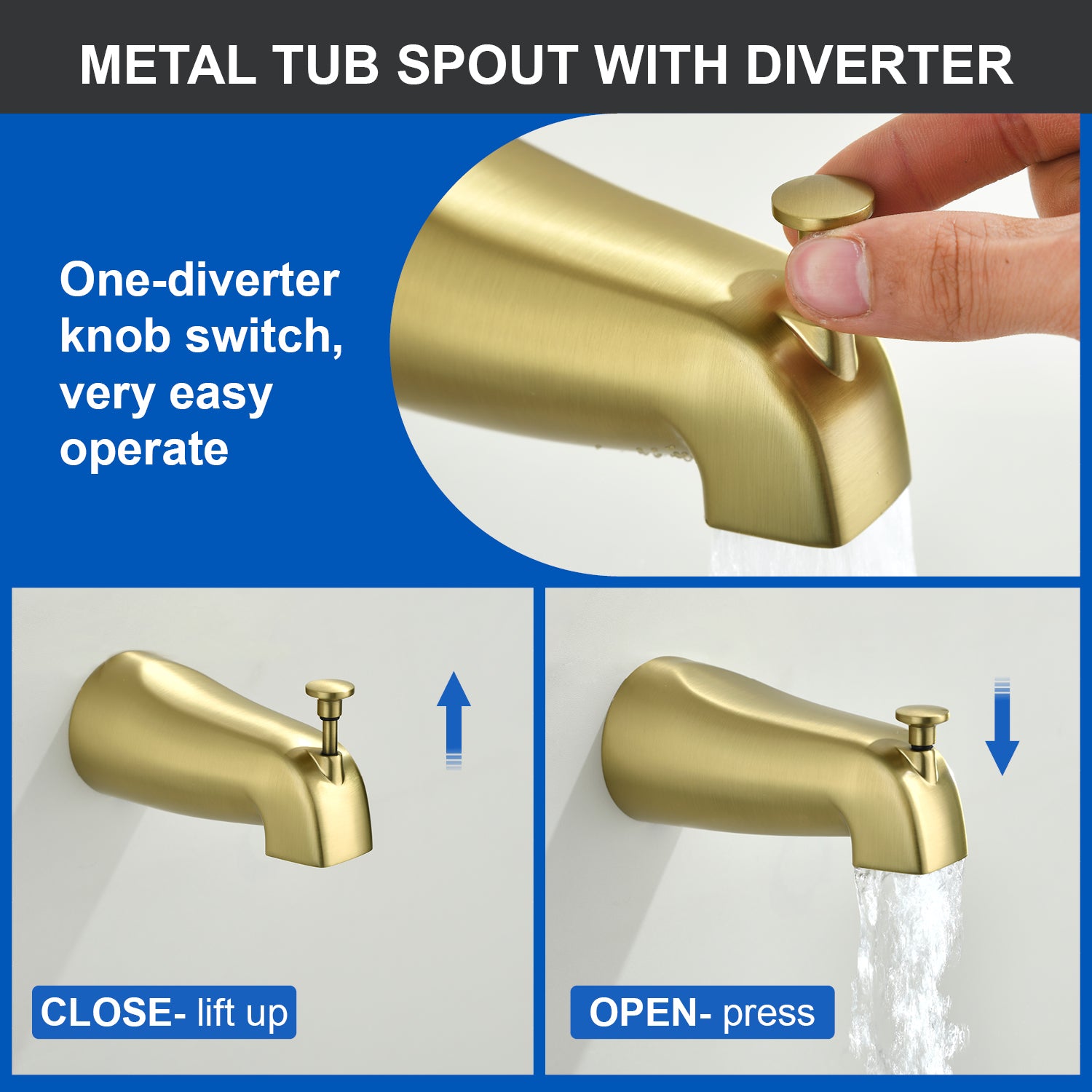 5-Spray Head Shower You can choose one, two or more of five functions coming out water which will bring you more fun when you are taking a shower. Tub Spout with diverter Tub spout with diverter, is made of metal, which is durable, corrosion-resistant and rust-resistant. High pressure water flow...