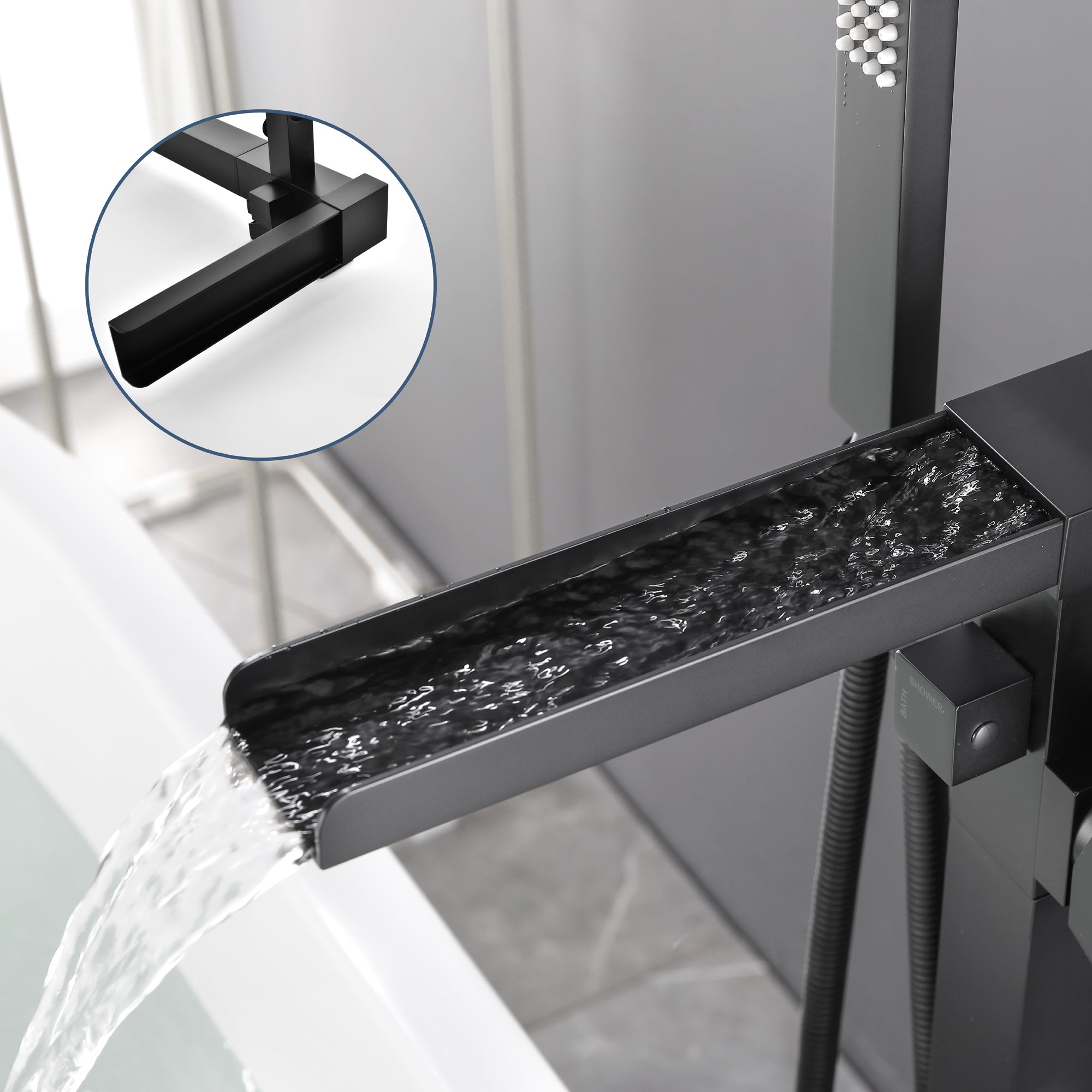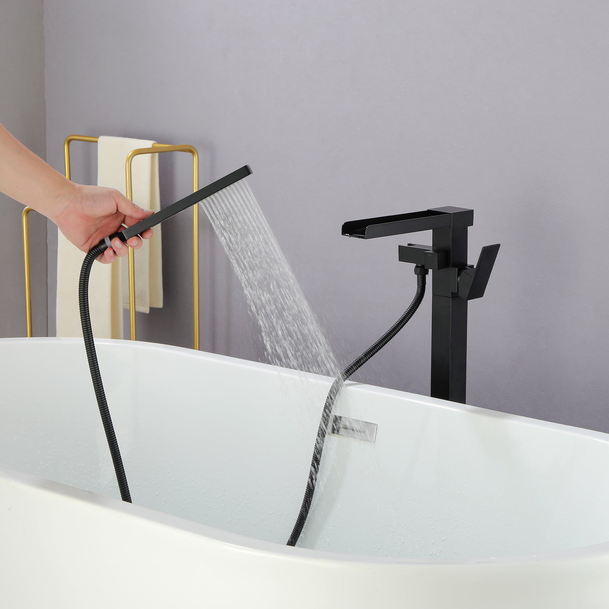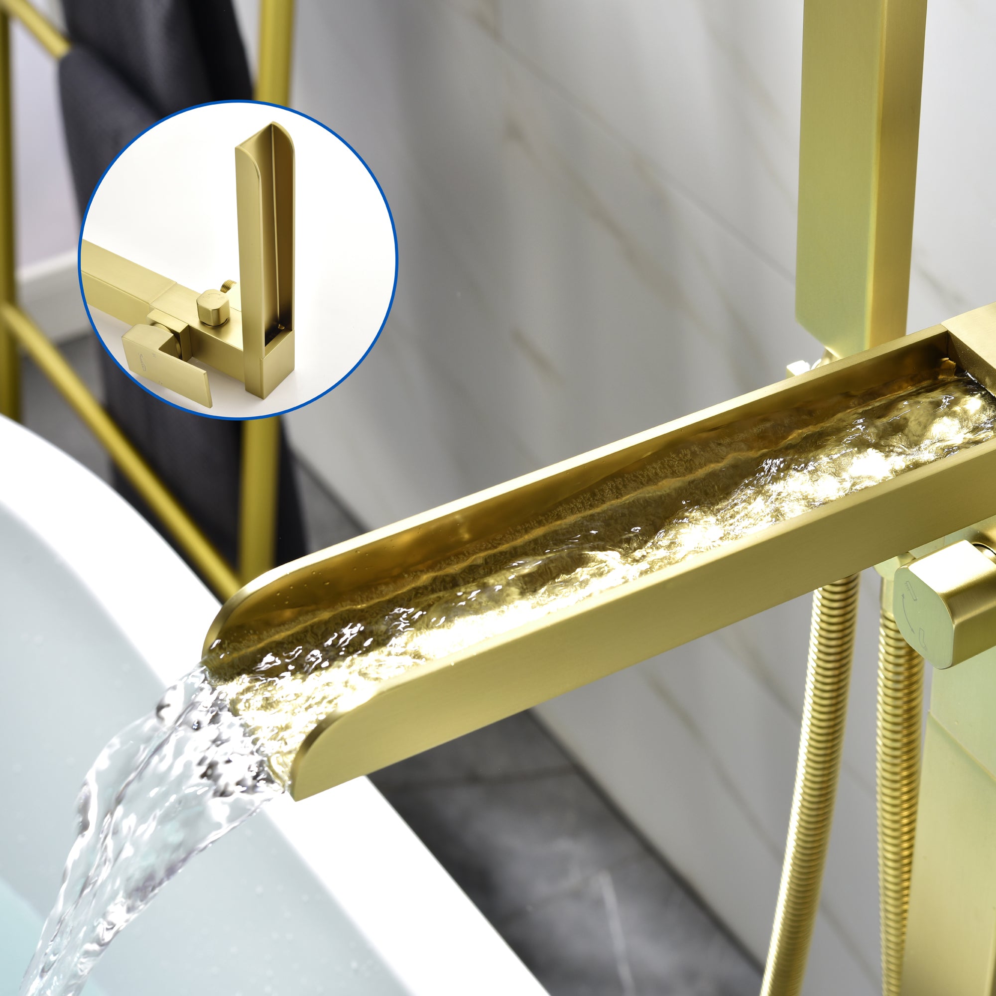 Freestanding Bathtub Faucet Single Handle Waterfall Tub Filler with Handheld Shower Brushed Gold