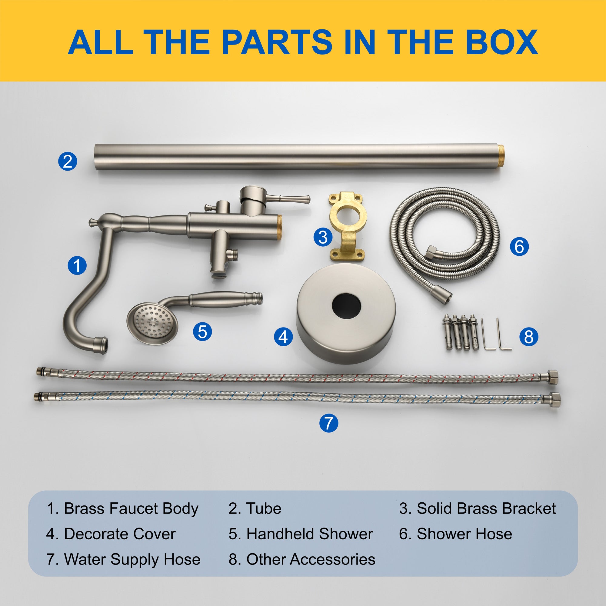 - Overall standing filler height 42.2 inches. The included hand shower hose is 59 inches long, while the roman tub spout swivels 360 degrees, giving you maximum flexibility and control.