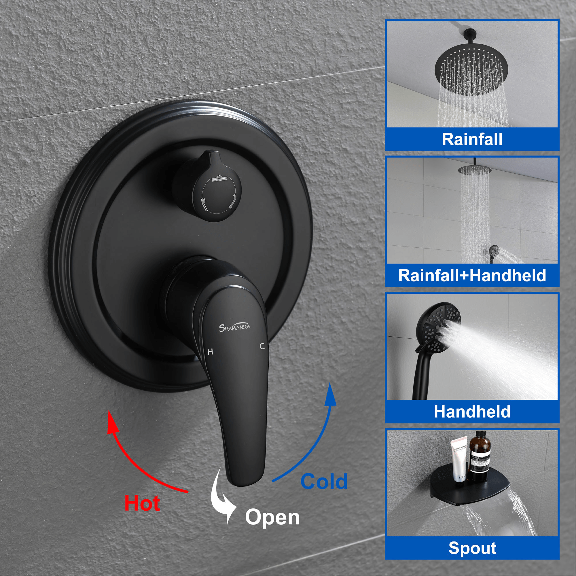 3 functions shower faucet set Simply slide lever on rainfall shower head or handheld to get luxurious water flow: tub spout, You will get lot of fun and relax while showering with this rainfall shower head with handheld spray set 360° Shower Head 12" rainfall shower head can bring you...