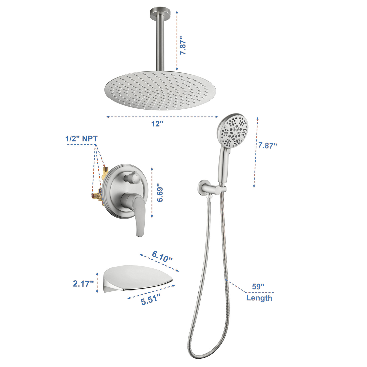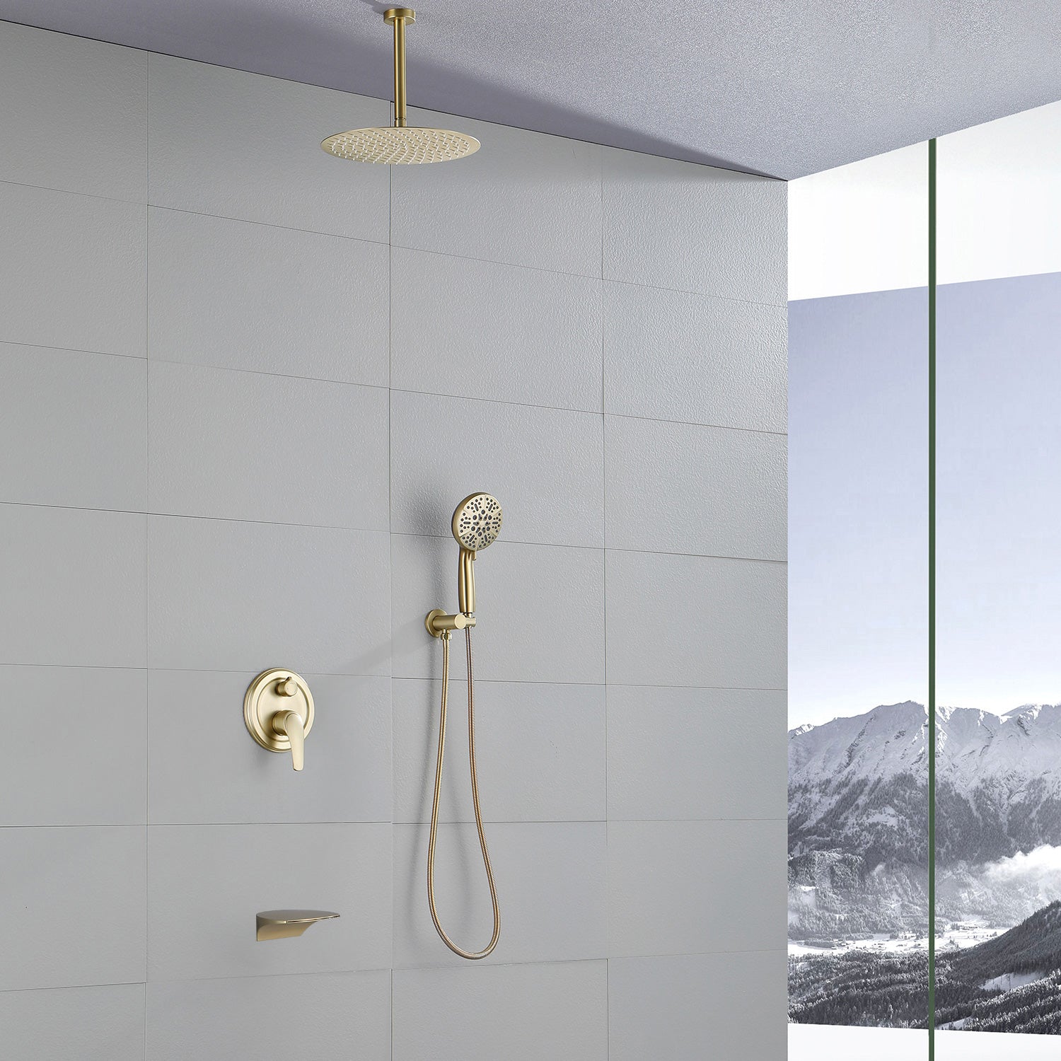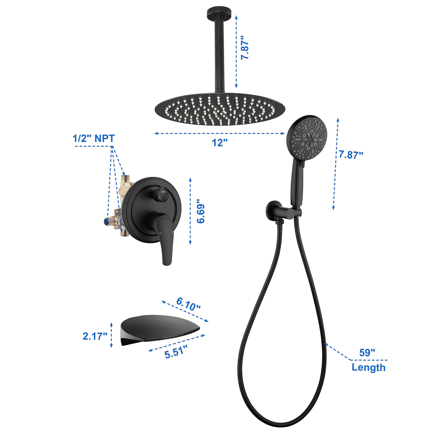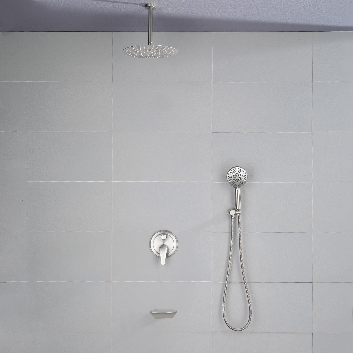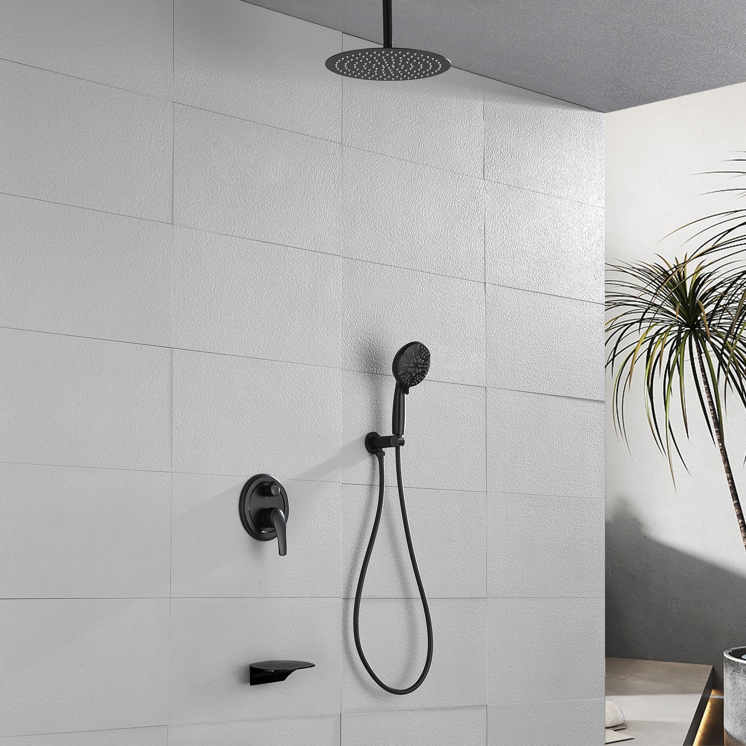 Single Handle 12" Ceiling-Mounted Bath and Shower System Set with 7 Settings Hand Spray, Waterfall Spout