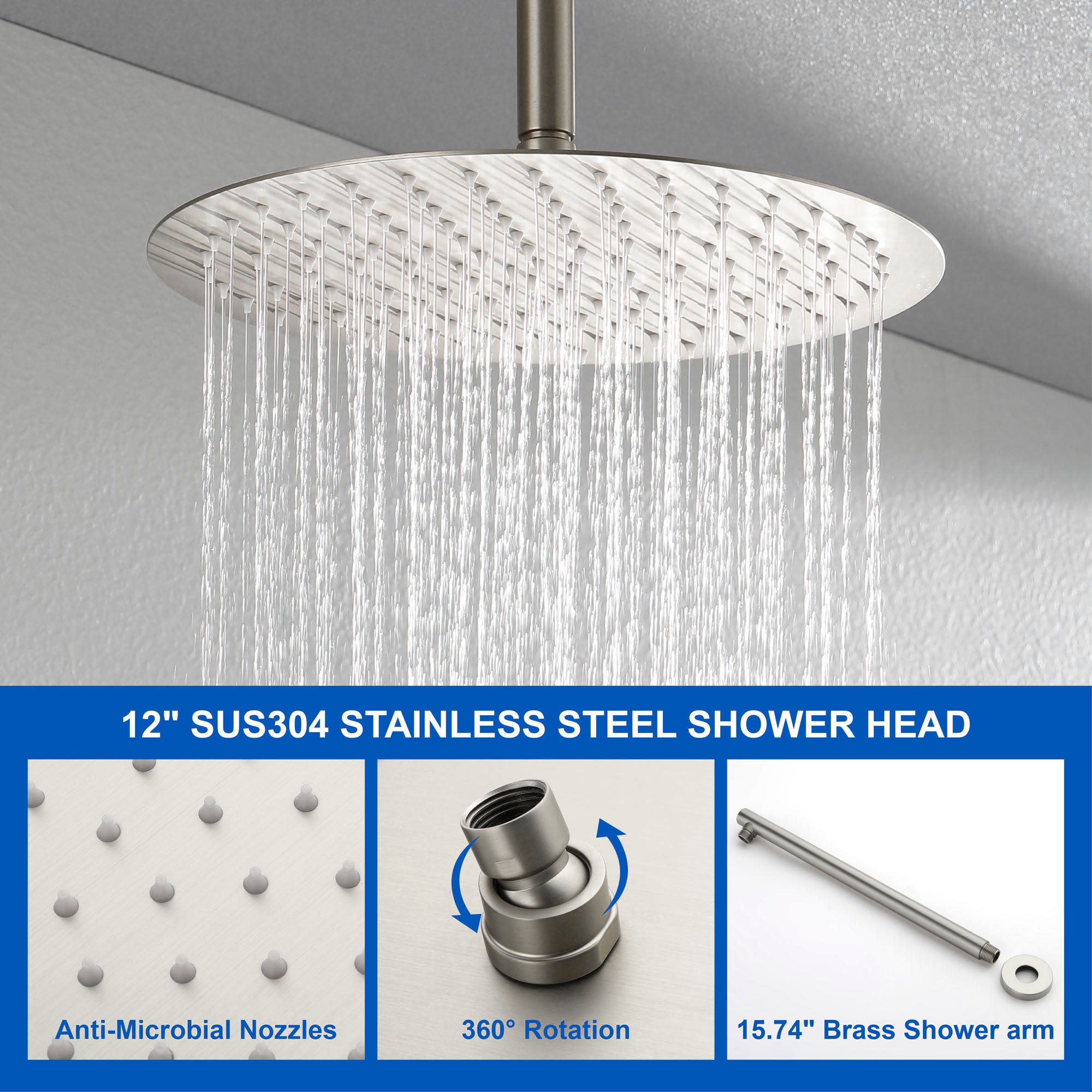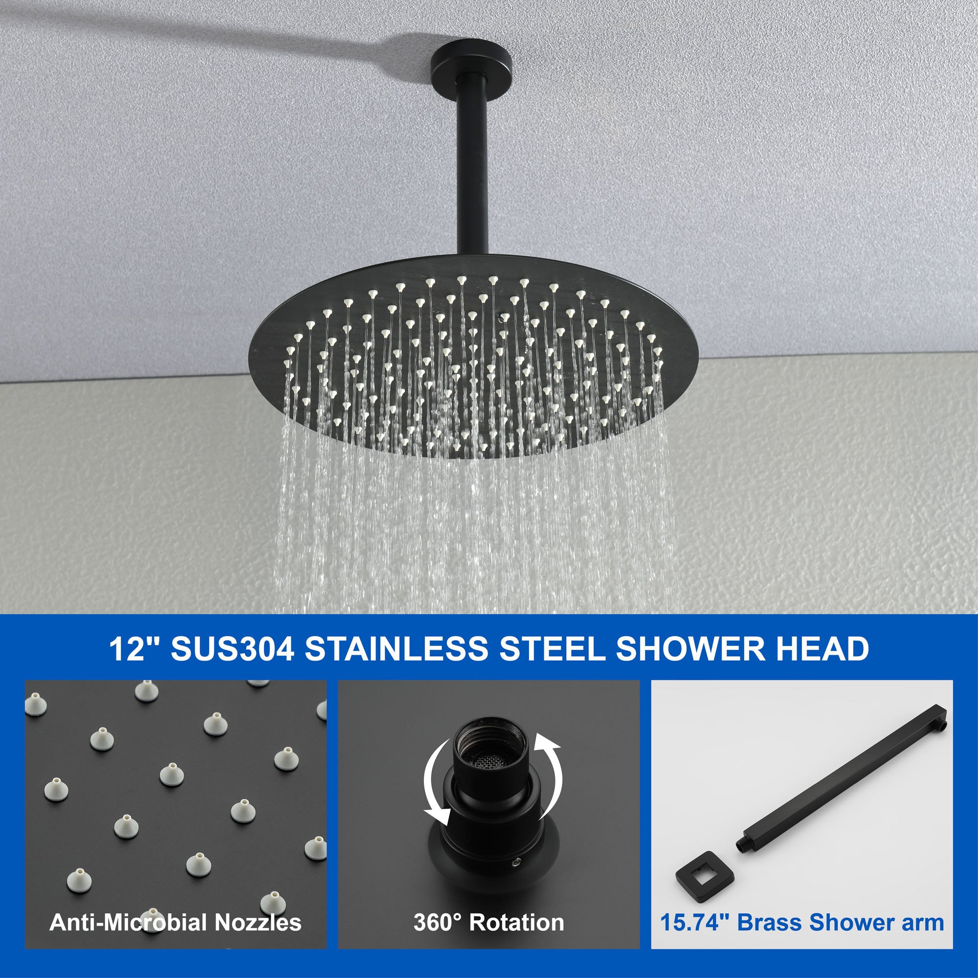 - 12" rainfall shower head can bring you SPA feeling at home, Freely adjust the angle of the shower according to your need to improve the shower experience.