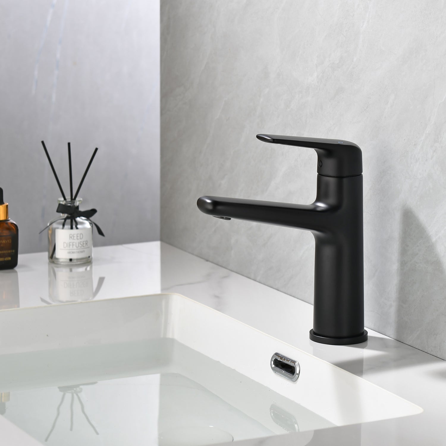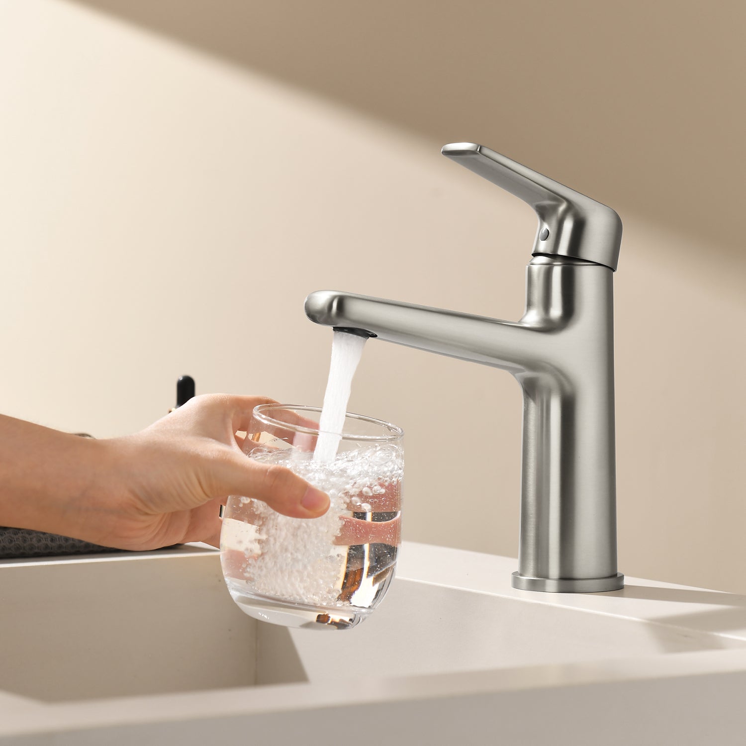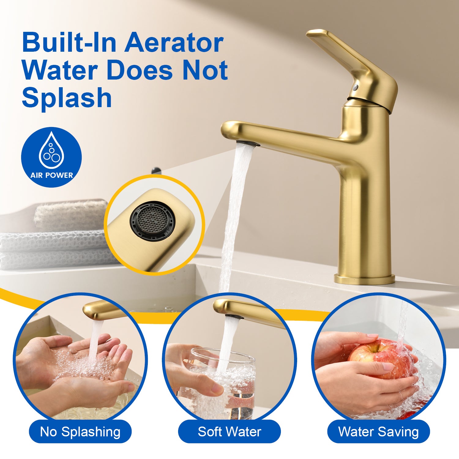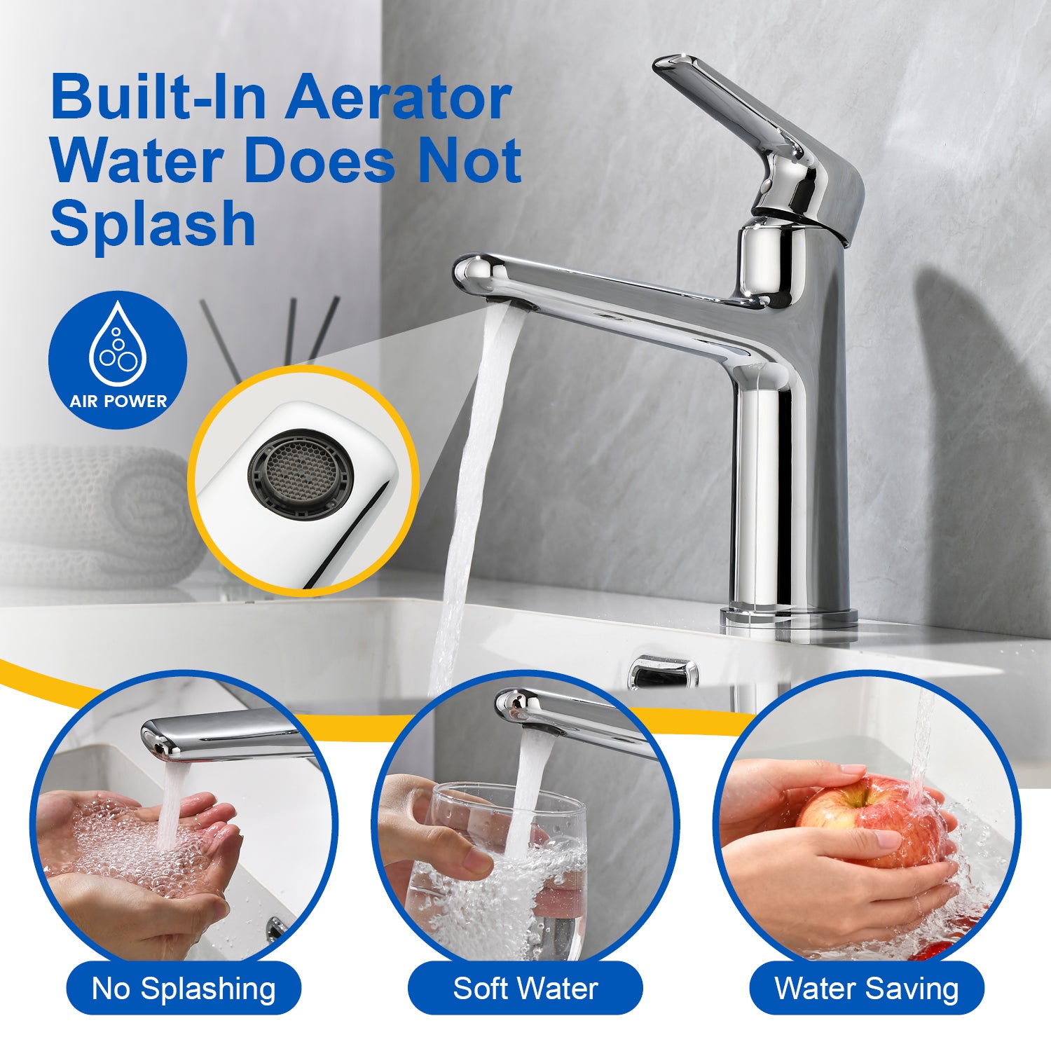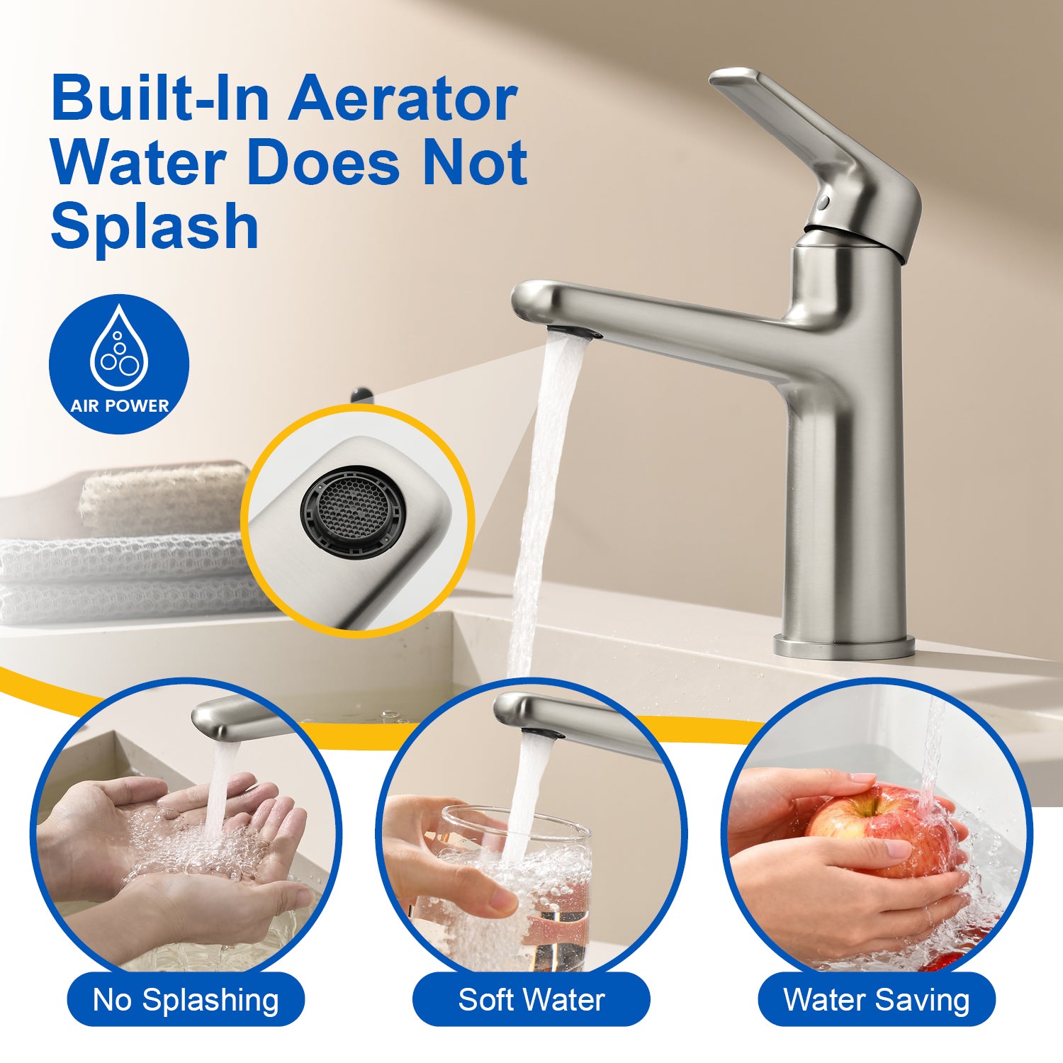 Built-In Aerator The built-in aerator in the bathroom faucet not only makes the water flow softer, but also saves more water and reduces noise. Single-Handle Bathroom Faucet The smooth handling of a single lever makes it easier to regulate water flow or temperature. A clear and steady laminar stream that...