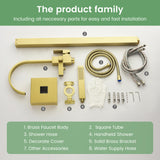 - Standing tub faucet body, brass faucet tube, hand shower, hot and cold hoses, base cap, mounting hardware, and installation instructions.
