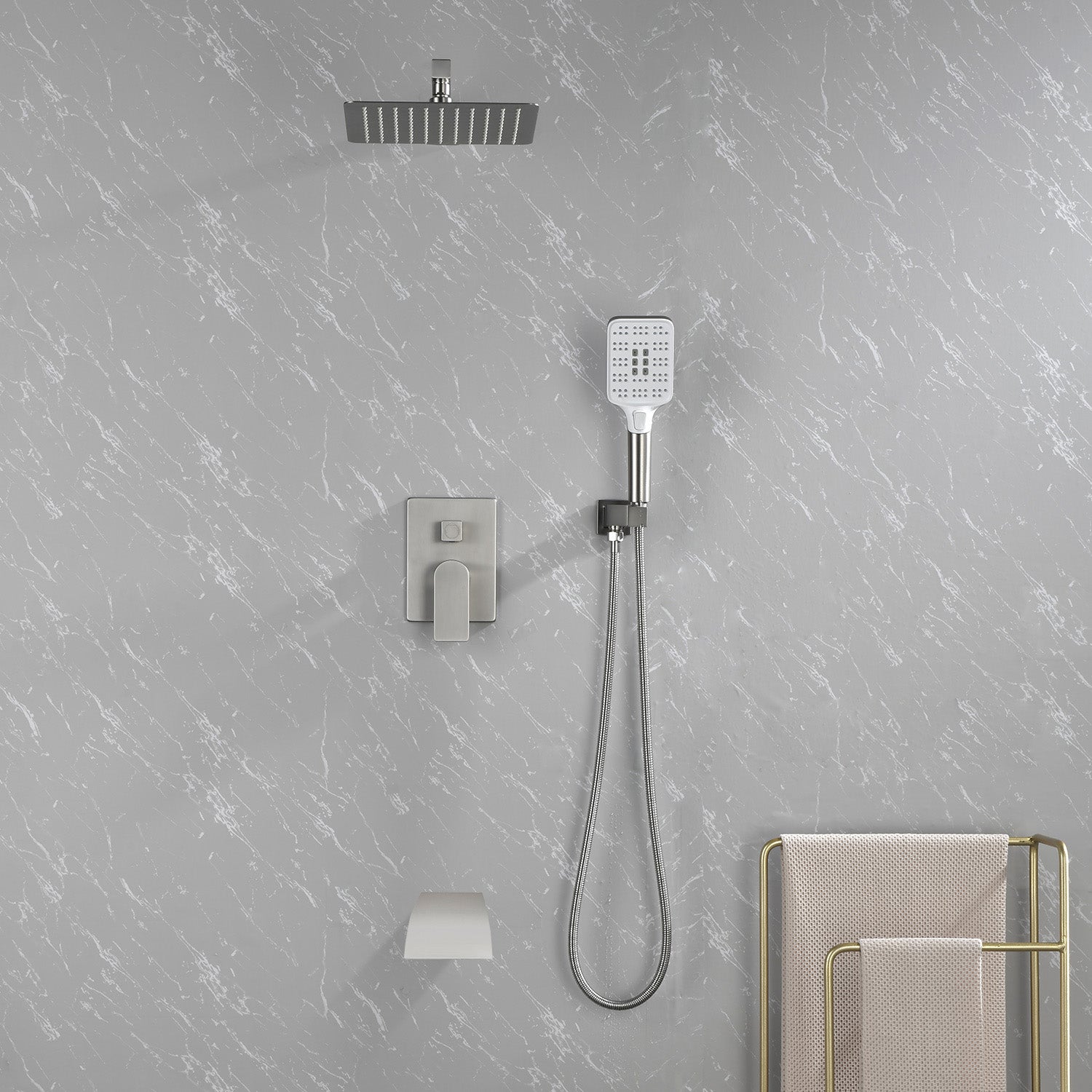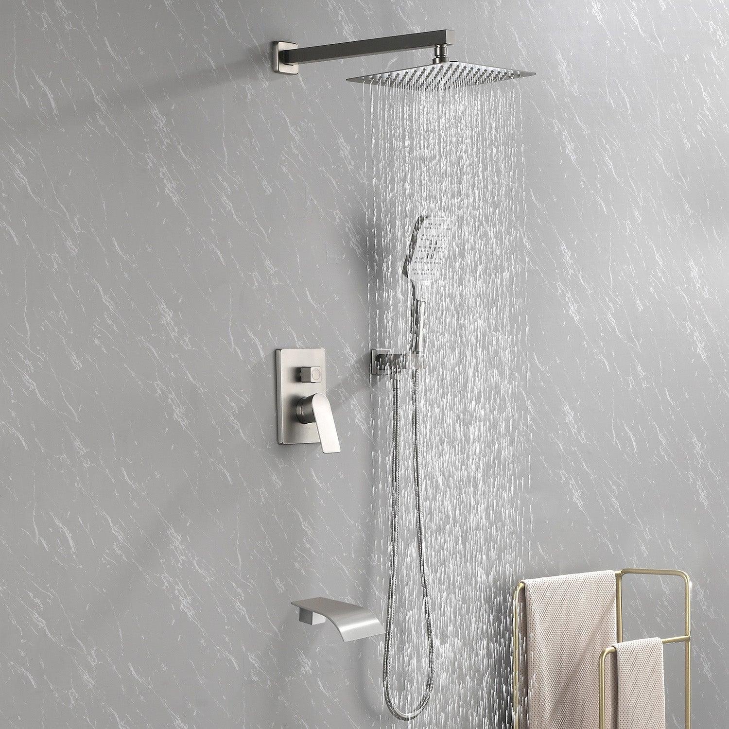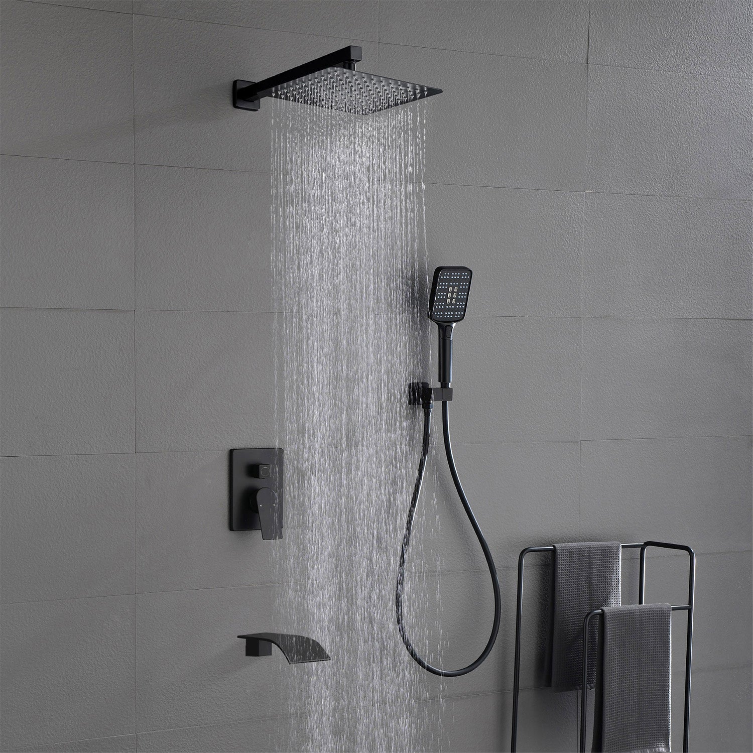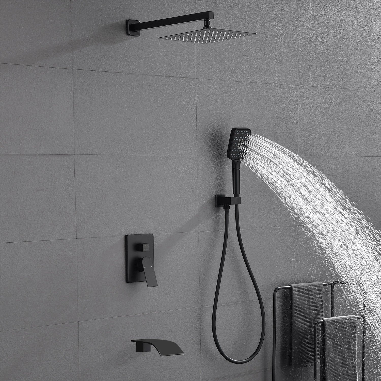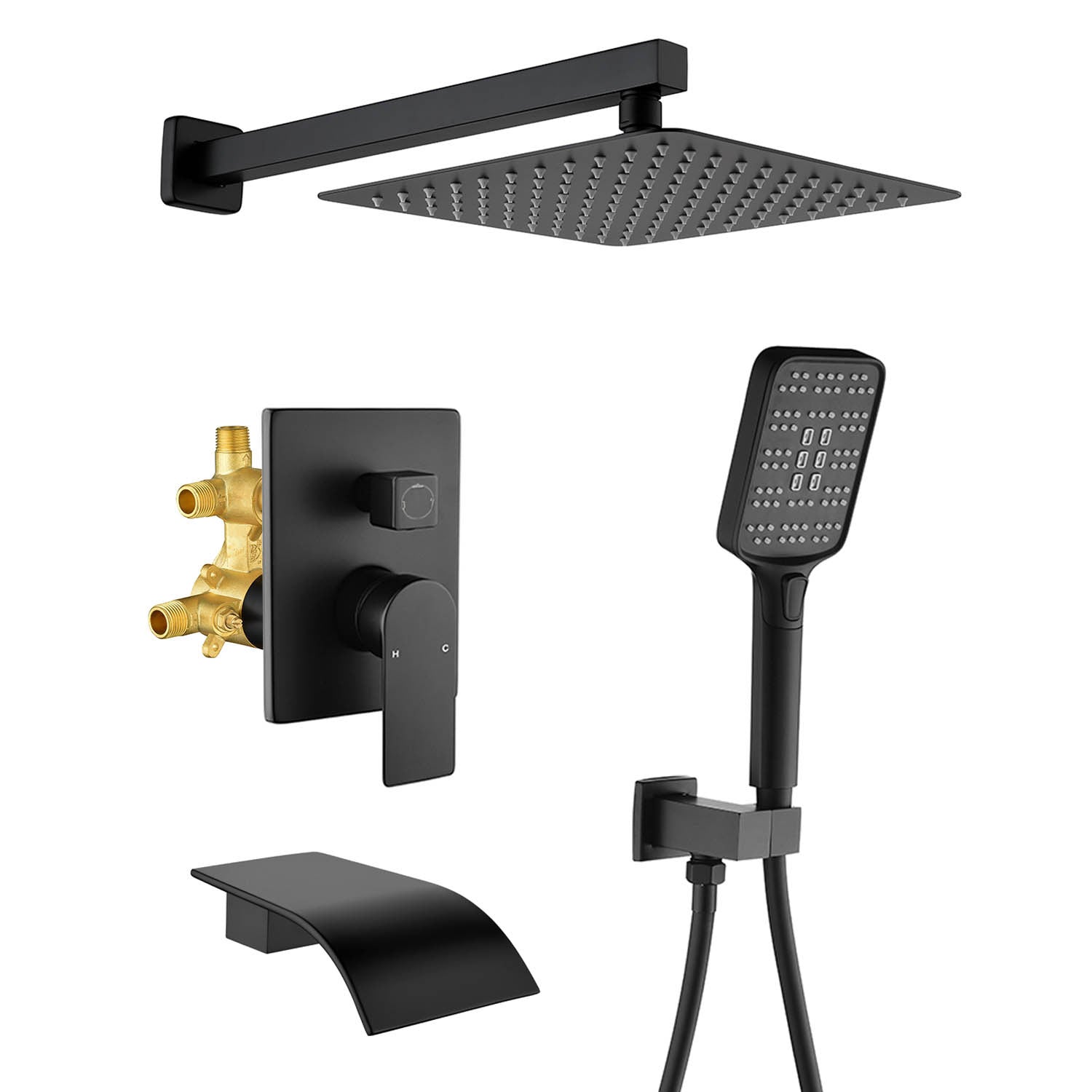 Square 10-inch Rainfall Shower Head Set with 3-Setting Handheld Shower and 4.72-inch Waterfall Spout