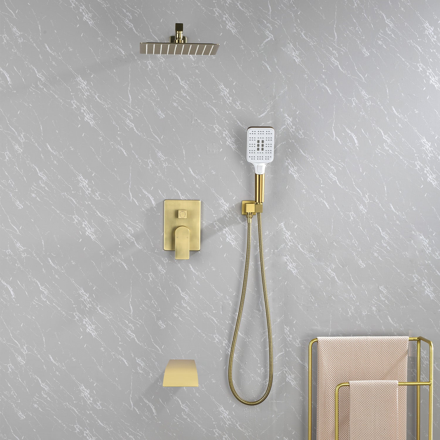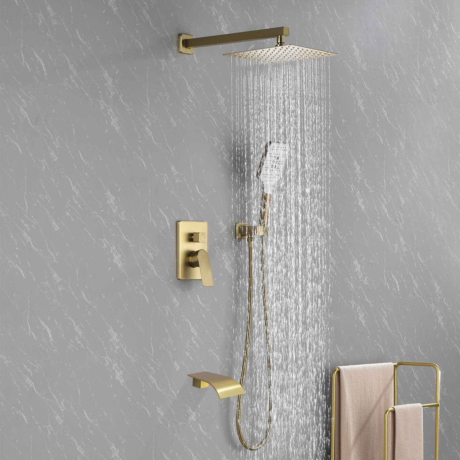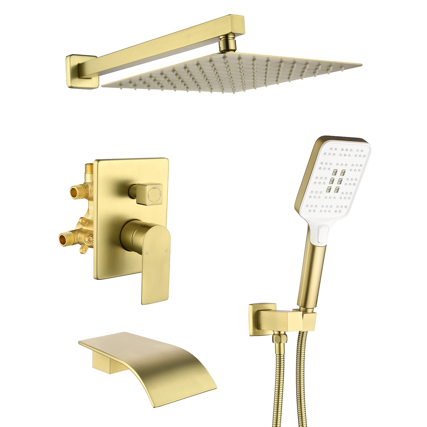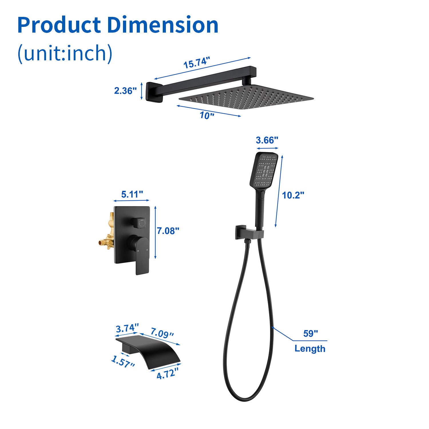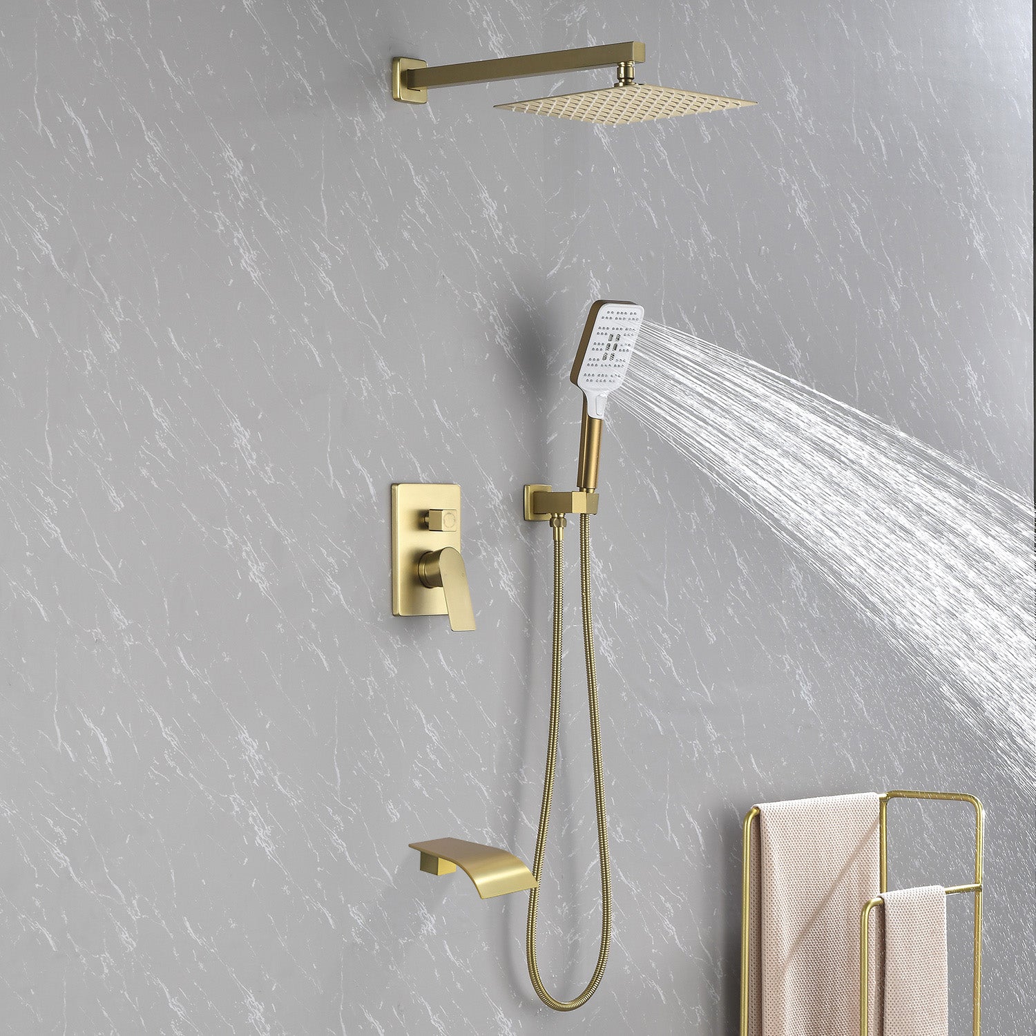 Square 10-inch Rainfall Shower Head Set with 3-Setting Handheld Shower and 4.72-inch Waterfall Spout