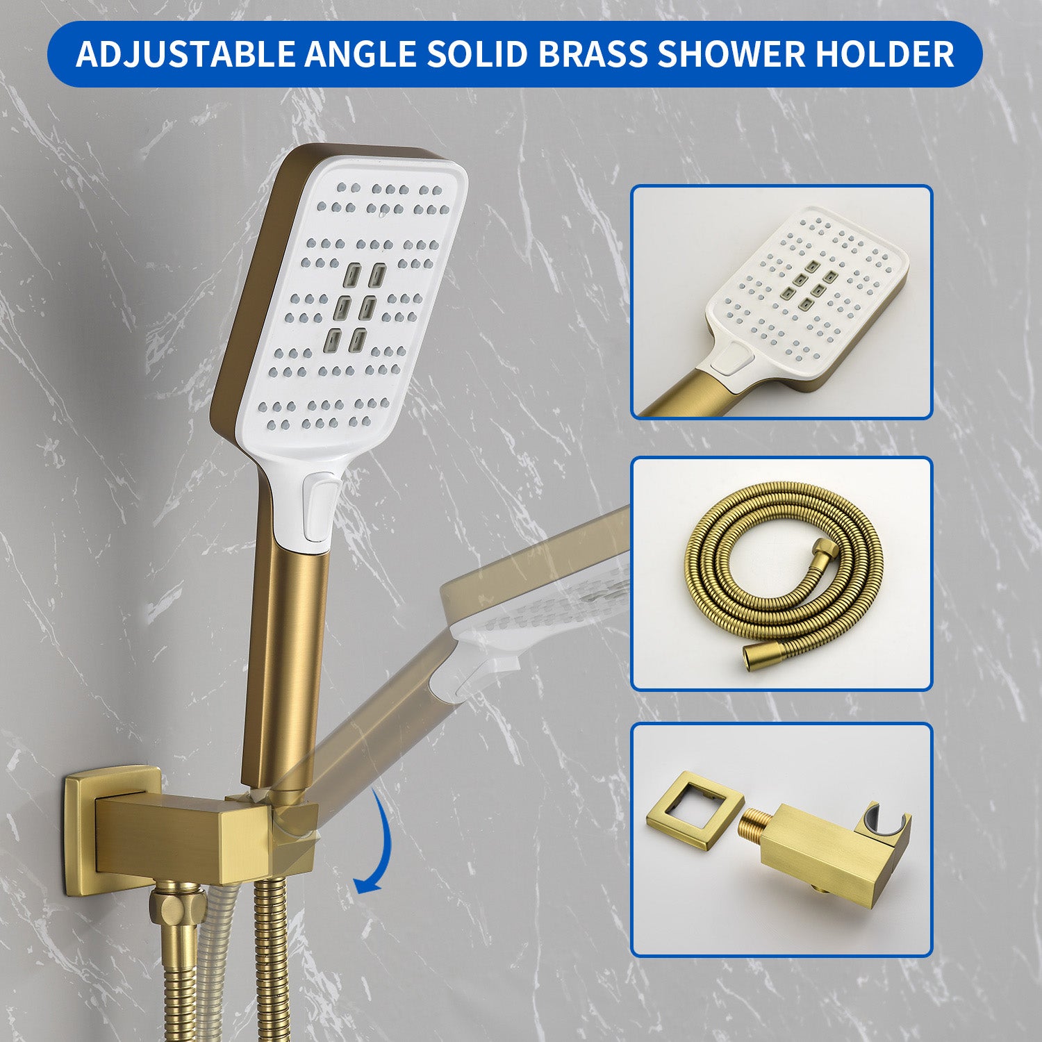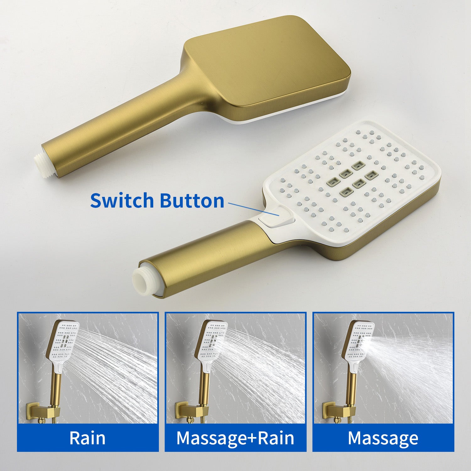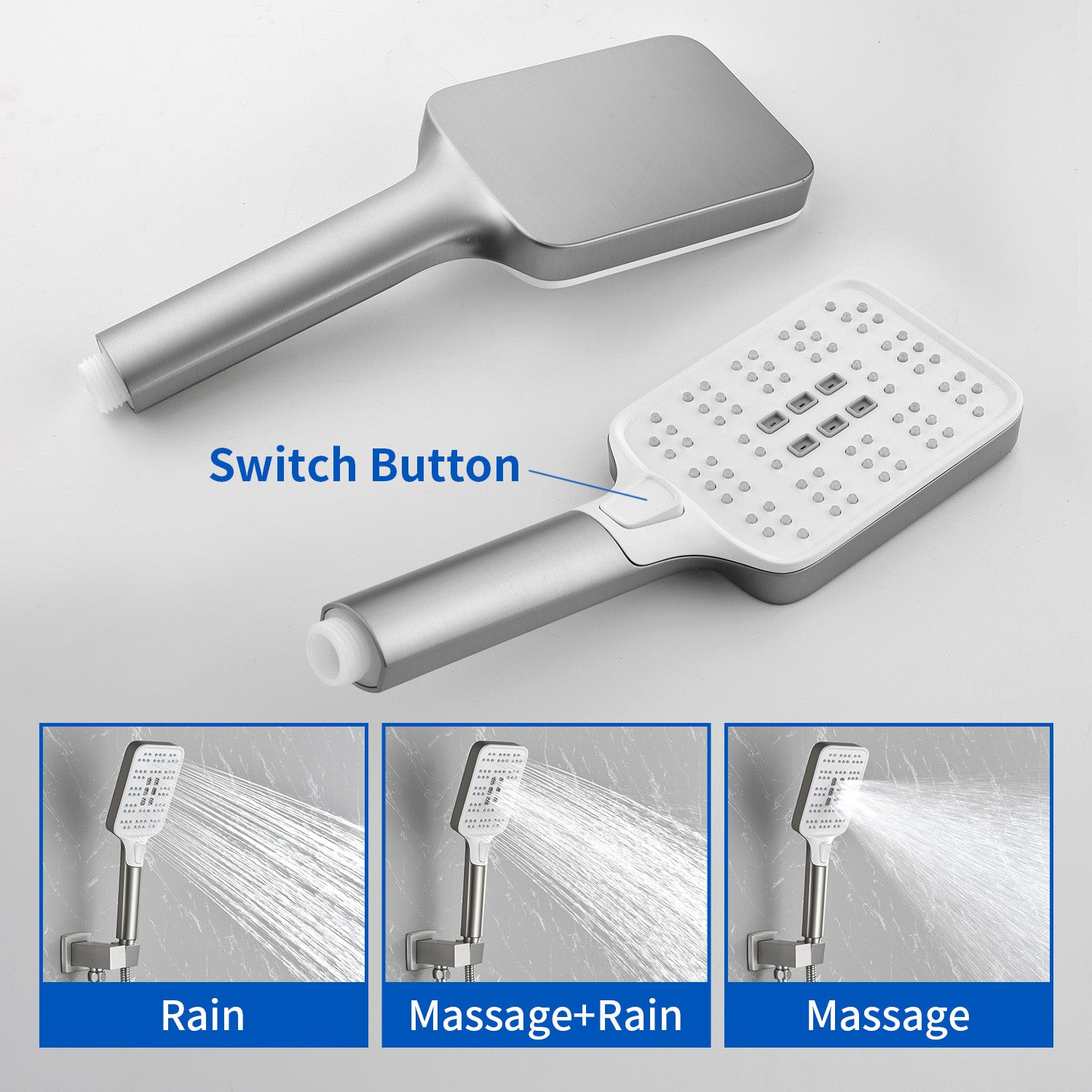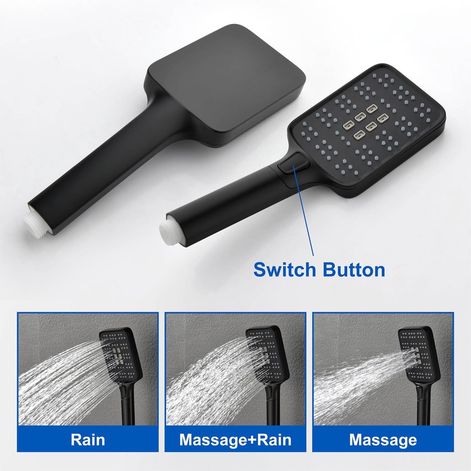 - Features a comfortable ABS handle with three clearly marked function buttons (e.g., Power Rain, Massage, Mixed Spray) for easy mode selection during use.