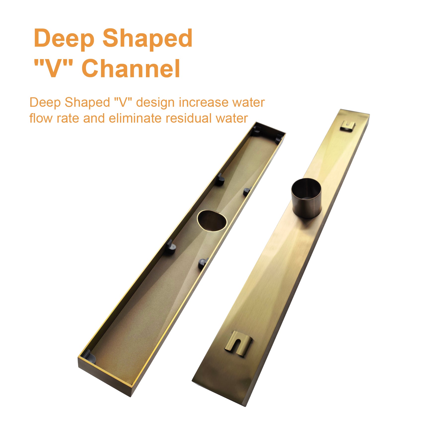 Modern Aesthetics, Creating a Stylish Bathroom This 24-inch drain features clean, sharp lines and a minimalist rectangular design, designed to blend seamlessly into modern and American contemporary bathrooms. It combines functionality with sophisticated design, presenting a high-end and elegant look. Deep "V" Linear Drain Maximum flow. Zero pooling. The angled...