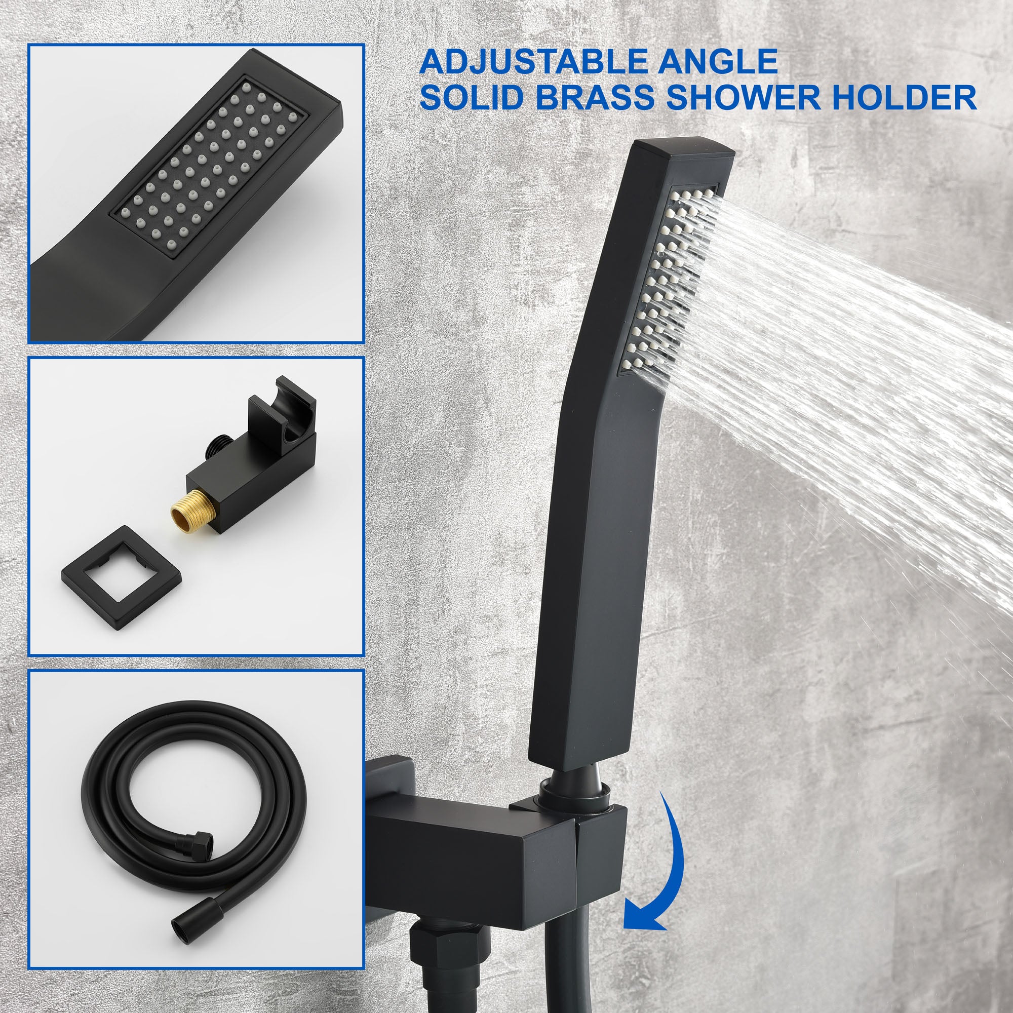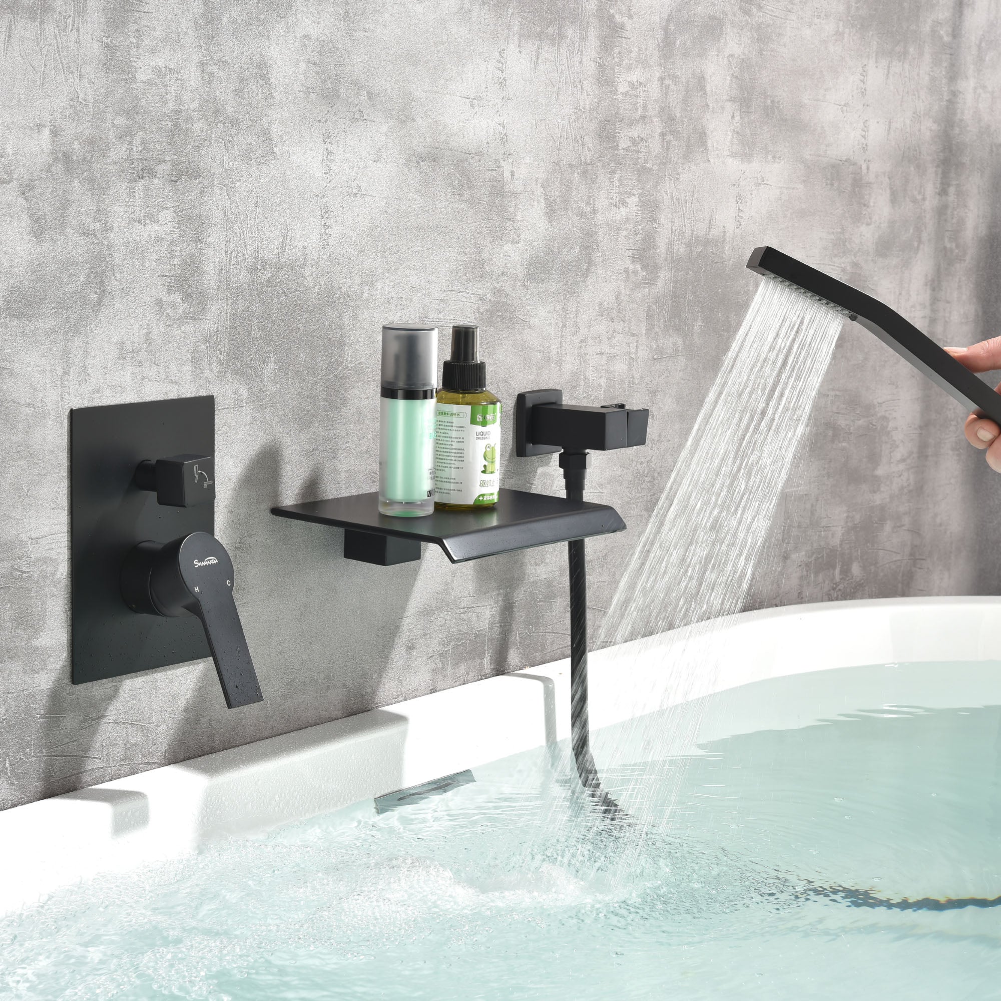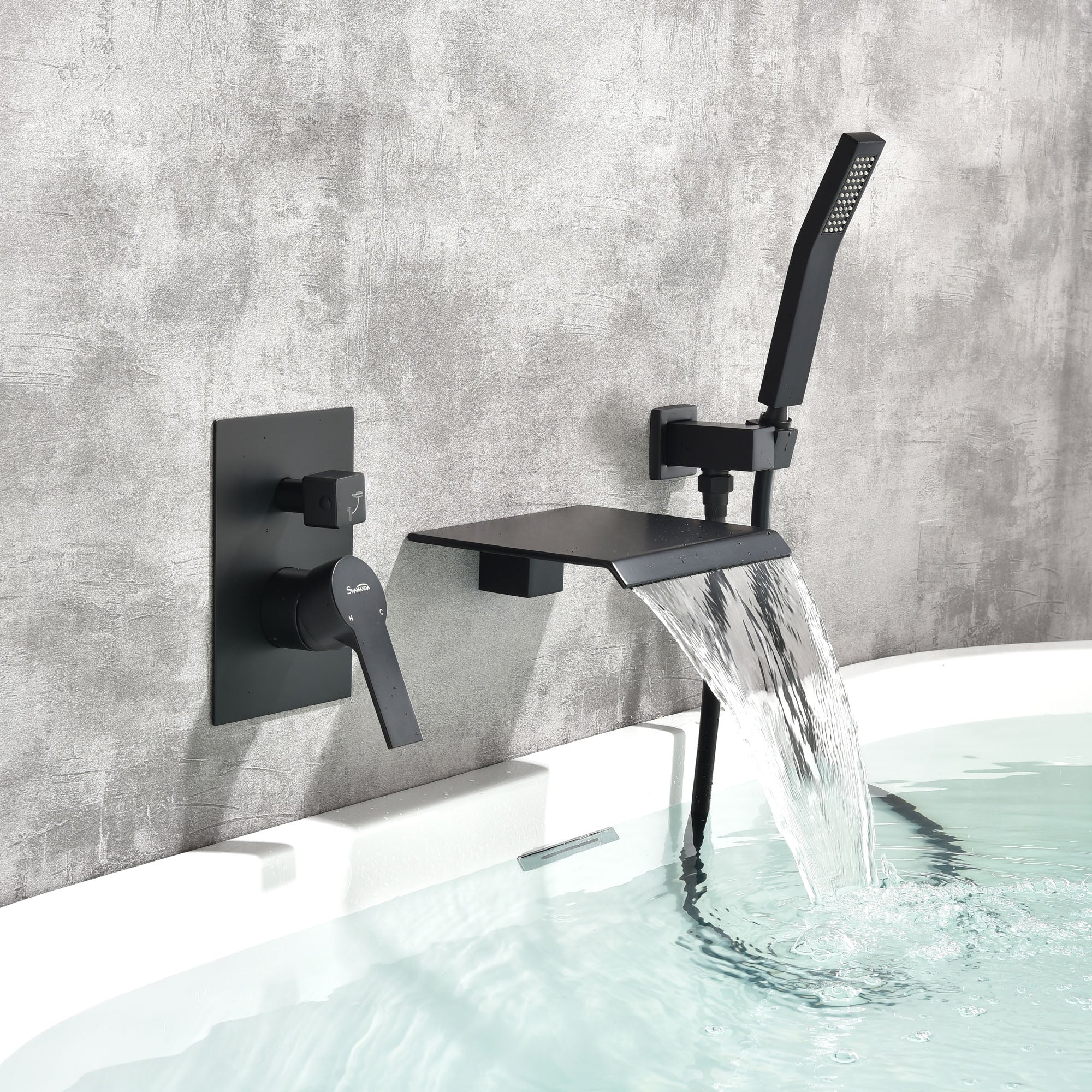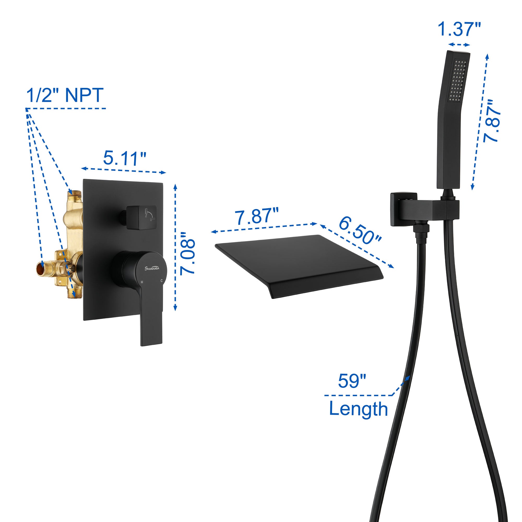 - You can switch hand shower or waterfall spout by rotating the square knob. The lever handle is easy to adjust temperature and water flow.The waterfall spout is firmly fixed to the wall and it can hold up shampoo or other shower supplies.Constructed with pressure balance valve to protect you from scalding when the hot or cold water pressure changes suddenly.